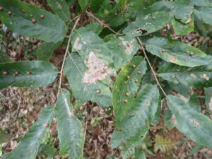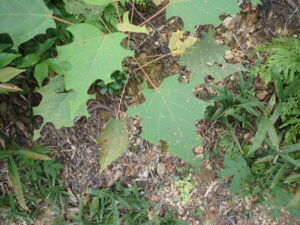 こちらはアカメガシワですが、葉がハキリバチによって何か所も切り取られていました。