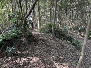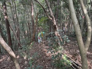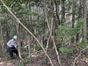 この日は、20分程山を登った先の山道周辺の斜面の間伐を行いました。